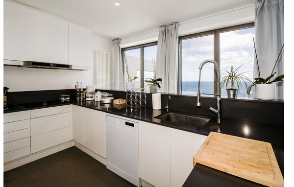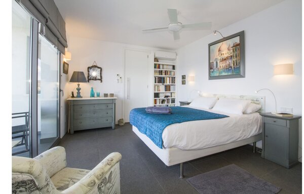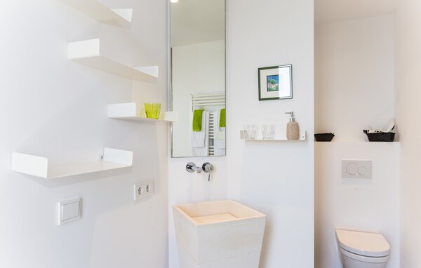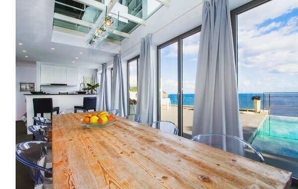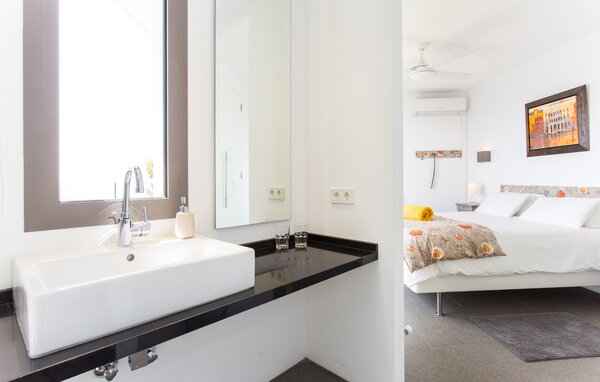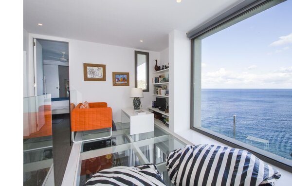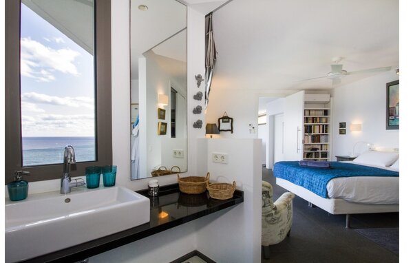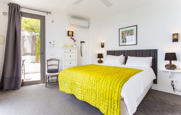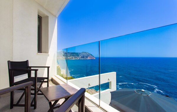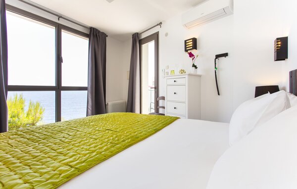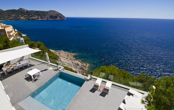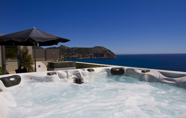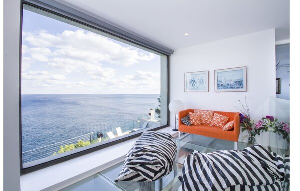 Access to the villa is from the top with a lift that transports guests from the car park to the open-plan main living area. The kitchen is seamlessly integrated into the dining and living area and offers views and easy access to the pool terrace through large sliding glass doors. The villa has two double bedrooms with en-suite bathrooms and small terraces with sea views, as well as additional living space in the basement with panoramic windows and two further double bedrooms. All sleeping areas are air-conditioned and the villa is equipped with heating, ensuring year-round comfort for a pleasant stay at Villa Can Ema.