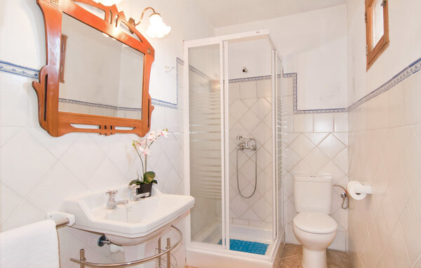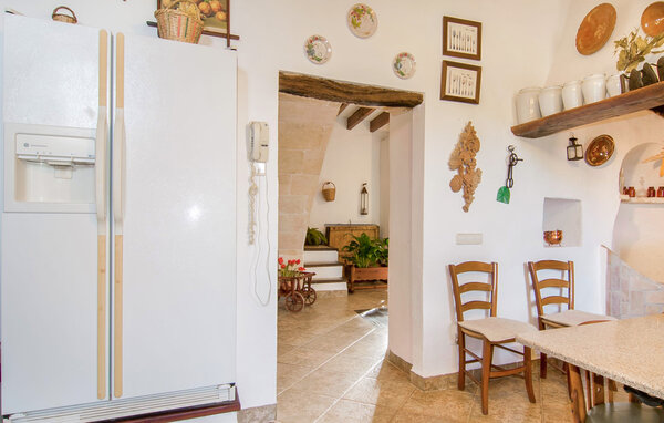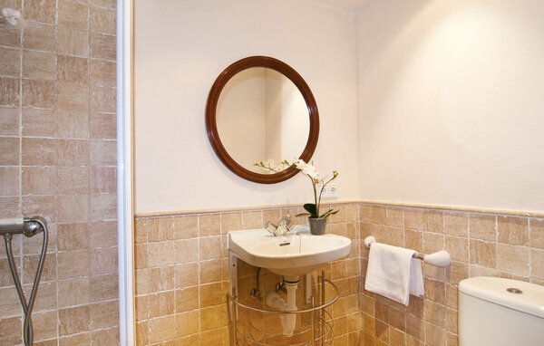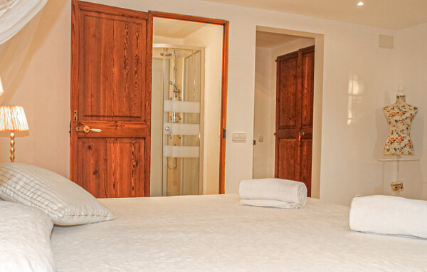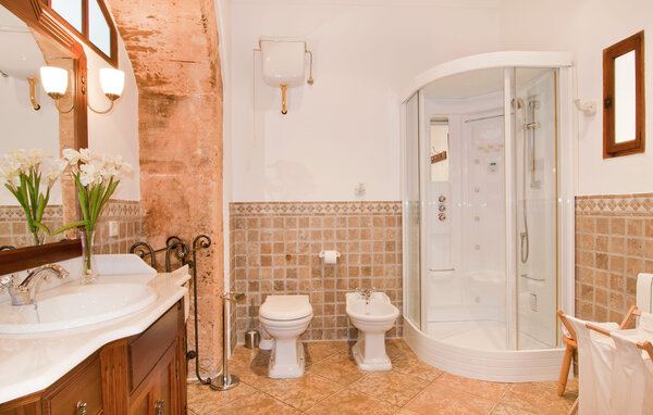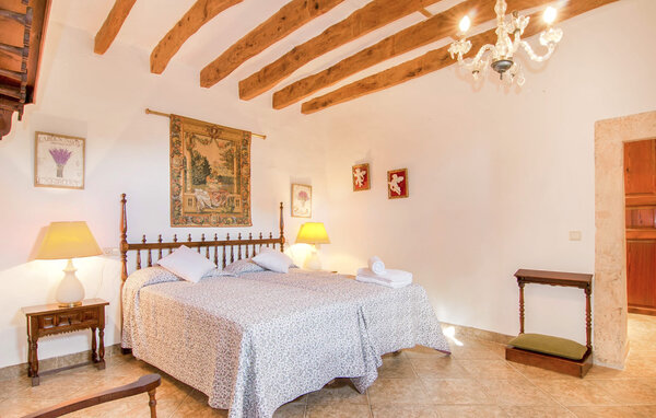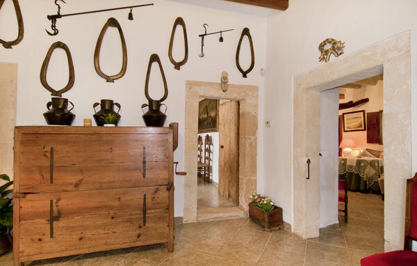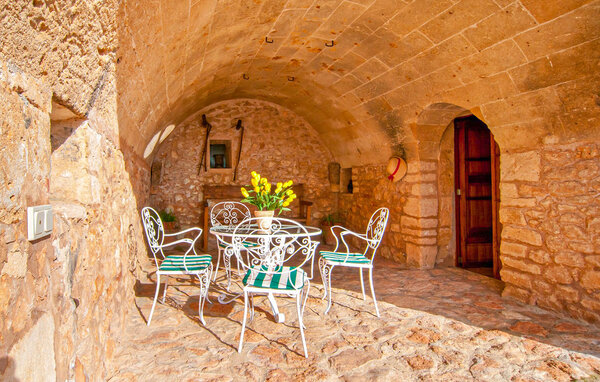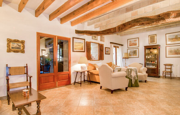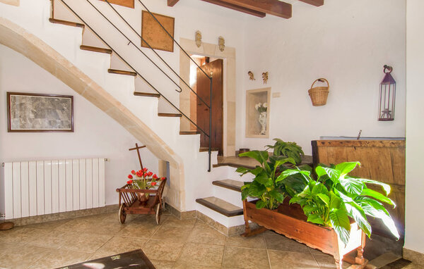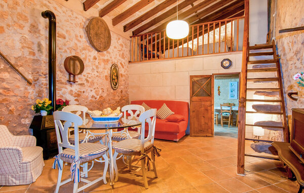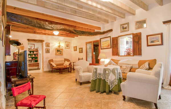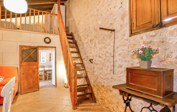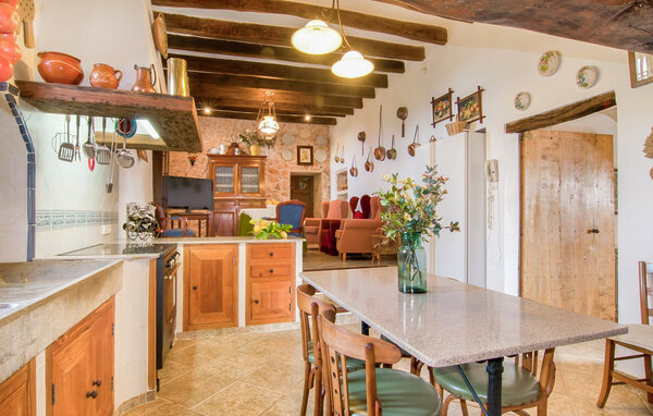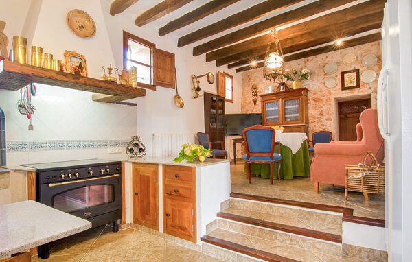The main house is beautifully designed. Exposed quarry stone masonry and wooden ceiling beams clearly harmonise with the many agricultural artefacts. A modern fireplace in the kitchen, where the cooker used to be, hand-painted typical Mallorcan wall tiles and the modern comfort of the American fridge with ice machine are in no way at odds with each other. This old cottage has been brought up to date to meet modern requirements and at the same time subtly convey details of its past with collections of old jugs, wall plates, copper pans and other lovingly arranged details. The living area with armchairs and chairs in different colours is located on a second level away from the kitchen. There is even a television. The very spacious living room has another LCD television.