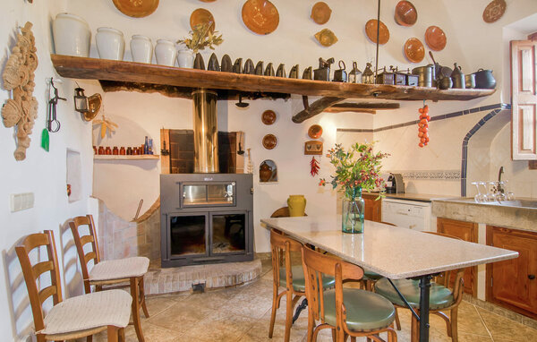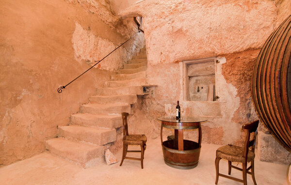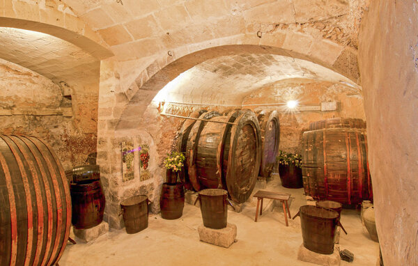 In addition to the very comfortable and cosy living and sleeping areas, there are numerous seating options in the outdoor area. Here you will find a large dining table with plenty of chairs, small shady benches and a coffee house ensemble of four chairs under an arch where you can enjoy your coffee in the sun or shade. The polyrattan sun loungers offer guests a comfortable place to lie down and enjoy the calm and mild Mediterranean climate or relax after a dip in the private pool. Fancy a little wine tasting? A special highlight is the vaulted cellar, which houses real wine barrels. A particularly rustic place to spend an evening or a day if the weather is bad