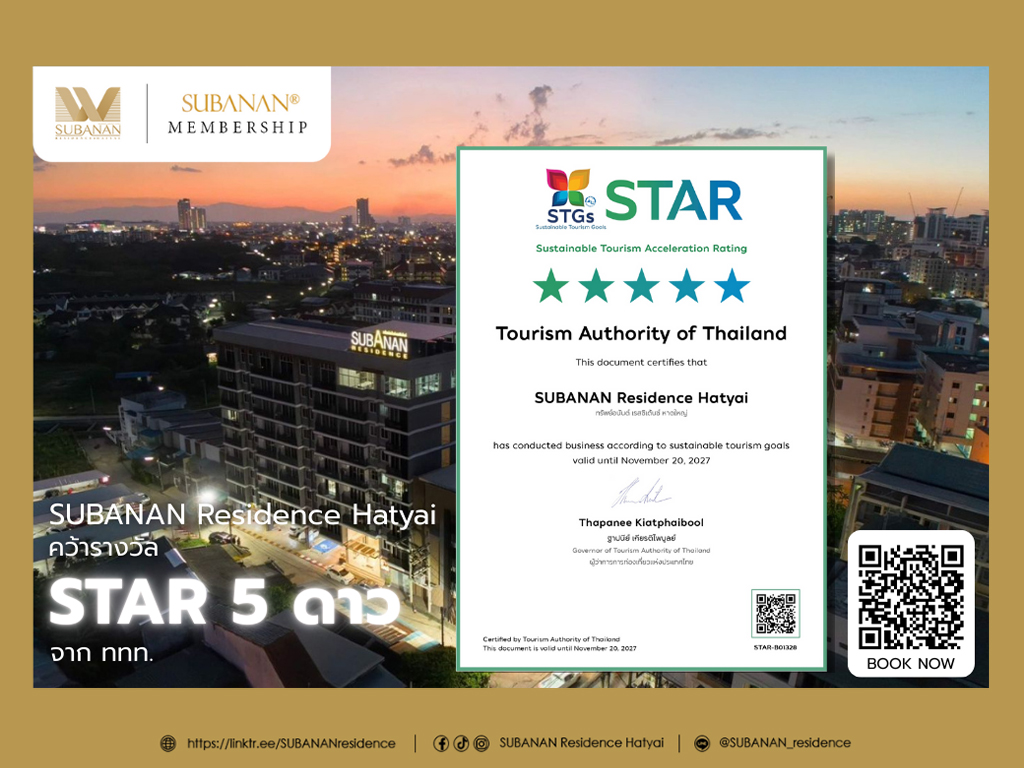 The SUBANAN Residence (SHA Extra Plus) offers the comfort and convenience of a 3. 5-star hotel near HatYai city center. Spacious rooms, available in five distinct types, feature refrigerators, flat-screen LED TVs with international channels, telephones, and private balconies with city views. Guests enjoy a range of services, including concierge and housekeeping. The hotel is conveniently located near Central Festival Shopping Centre, Asean Night Bazaar, and Prince of Songkhla University (PSU), and is a short drive from other key destinations.