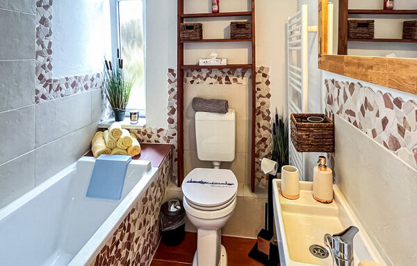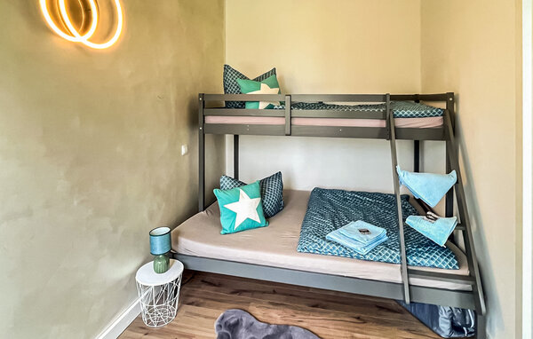 The approx. 65 sqm three-room holiday apartment for max. 5 people (including at least 2 children) is located separately on the ground floor of a residential building on the owner's approx. 4000 sqm residential property in a central location. The apartment was extensively modernised and refurnished in 2022. There is an open-plan living room (upholstered furniture with sleeping function, flat-screen TV, dining table), an open-plan kitchenette (dining counter, electric cooker with oven, fridge with freezer, various kitchen appliances), 1 bedroom (double bed), a children's bedroom with bunk bed (width of lower bed: 1.40 m), a hallway with storage space and a bathroom with bathtub including shower enclosure. The apartment is heated by central heating. There is a furnished outdoor seating area, secure storage for bicycles and a car park. Internet (WLAN) is also available. A travel cot and high chair can be provided for small children.