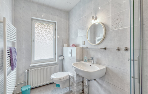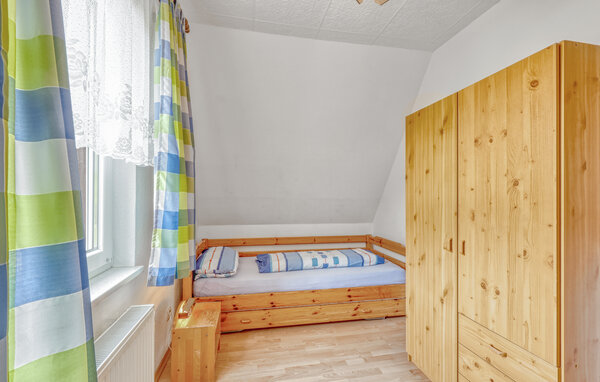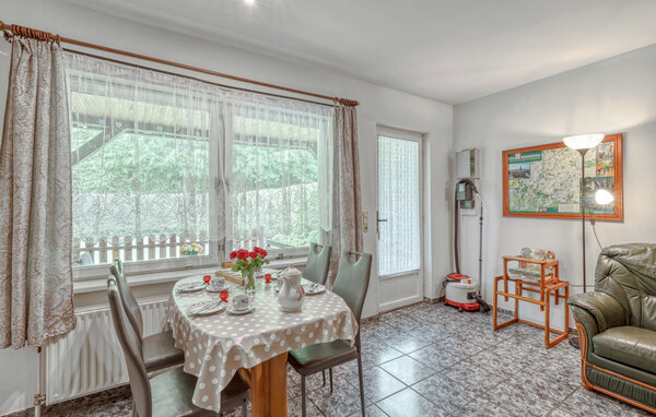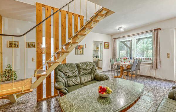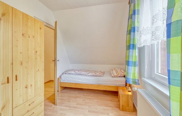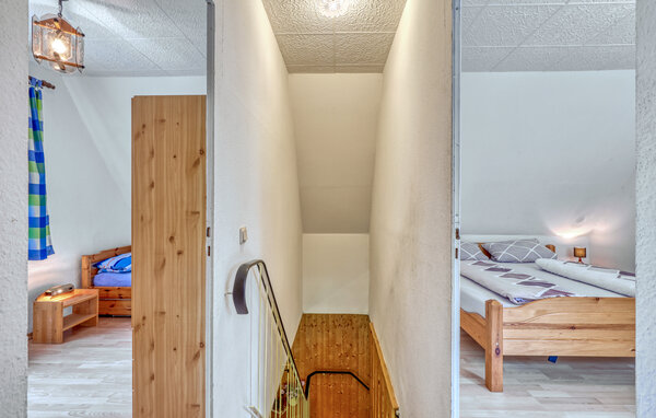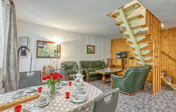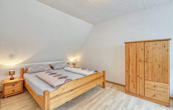The two approx. 60 square metre, centrally heated apartments (one half of the house each) extend over two floors and are equipped with a living room (upholstered furniture, dining area, flat screen TV, radio), 2 bedrooms via a staircase (1x double bed, 1x pull-out bed and lounger), a kitchen (hotplates or electric stove, oven, refrigerator, microwave, various small appliances) and a bathroom (renovated in 2022, floor-level shower, WC). bed, 1x pull-out bed and couch), a kitchen (hob or electric cooker with oven, fridge, microwave, various small kitchen appliances) and a bathroom (renovated in 2022, floor-level shower, WC, towel radiator). Each apartment also has a furnished terrace, sun loungers, barbecue, car park, campfire site, children's playground (for all guests) and washing machine on request (for a fee) Final cleaning is included in the total price; please bring your own bed linen and towels. To be paid on site: Energy and water according to consumption. One small dog up to a size of 40 cm is allowed in this accommodation.