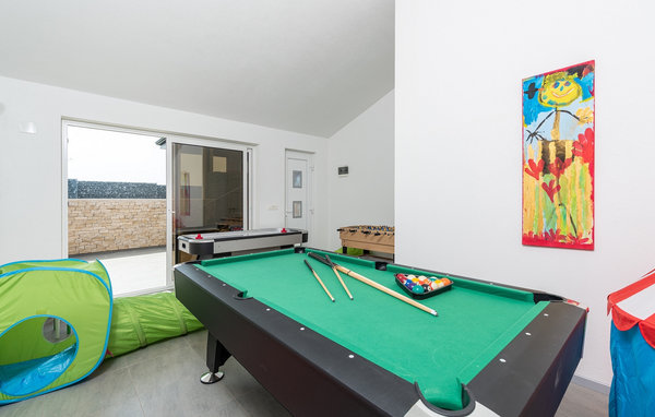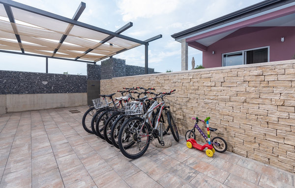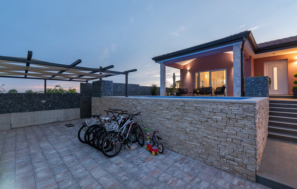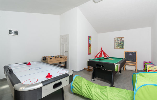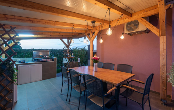 The villa has a children's playground, its own bicycles, which are available to guests free of charge, and a great playroom with a separate entrance. While the little ones play, the rest of the guests can enjoy a refreshing dip in the pool or soak up the Istrian sun on one of the sun loungers. Barbecue fans will be delighted with the beautiful outdoor kitchen. There you can let your eyes wander over the endless green of the fields while you prepare a delicious meal. The dining area on the terrace offers space for the whole family.