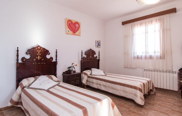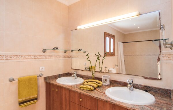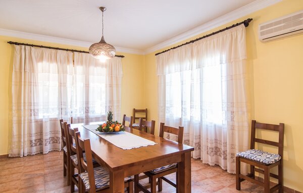 The interior of the villa is light and bright. White and a few sunny yellow walls, together with many small ceiling lamps and large windows, create a summery lightness that permeates the entire house. The furnishings are a mixture of practical, modern and traditional-rustic elements, so you will immediately feel at home. On the ground floor, you will find the spacious entrance area and the living room with a huge sofa and glass table: perfect for cosy TV evenings with tasty snacks! Alternatively, you can sit down for a meal together at the wooden dining table next door, which offers plenty of space for the dishes prepared in the kitchen. Once you've had your fill and get tired, you can simply retire to one of the three double rooms on the ground floor or the other double room on the upper floor. All rooms have elaborately designed single or double beds made of wood. The living comfort is rounded off by three modern bathrooms, two of which are on the ground floor and one en-suite bathroom on the first floor.