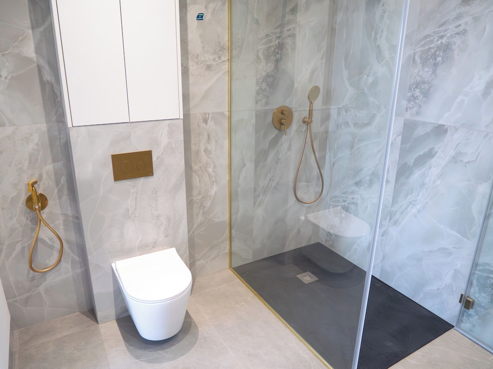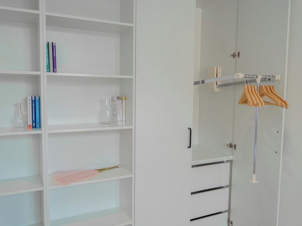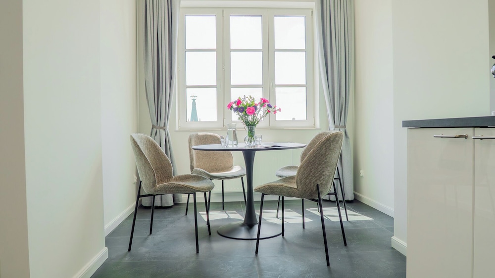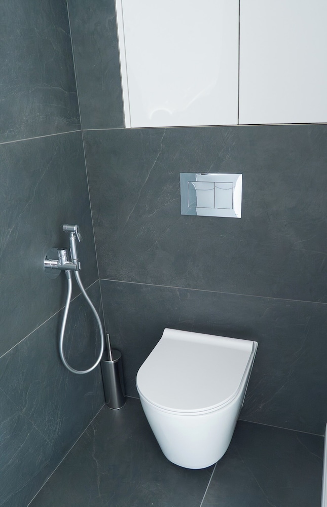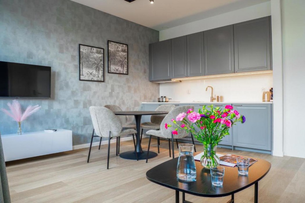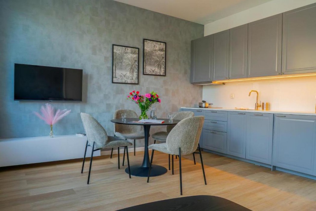 The 13 fully equipped apartments feature a comfortable living room, a kitchenette with an induction hob, a separate bedroom, a modern bathroom, and a toilet equipped with a bidet. The kitchen is equipped with appliances, a fridge, and dishwasher.