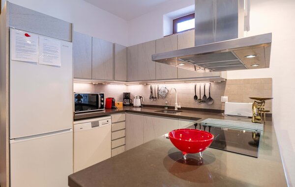 This lovingly renovated village house boasts a cosy and tastefully furnished interior and a real feel-good ambience. Experiment with fresh produce from the market in the open-plan kitchen and enjoy your meals in the inviting dining area. Browse through a book in the small library or enjoy a fun games evening with your loved ones.