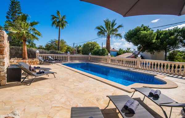 Palm trees frame the natural stone terrace with chic sun loungers and a parasol. The communal pool with its meandering mosaic tiles invites you to relax and is shared with the adjoining house - an ideal setting for a holiday with friends or family without sacrificing your privacy. The covered terrace is perfect for enjoying meals on hot summer days, perhaps cooked on the barbecue.