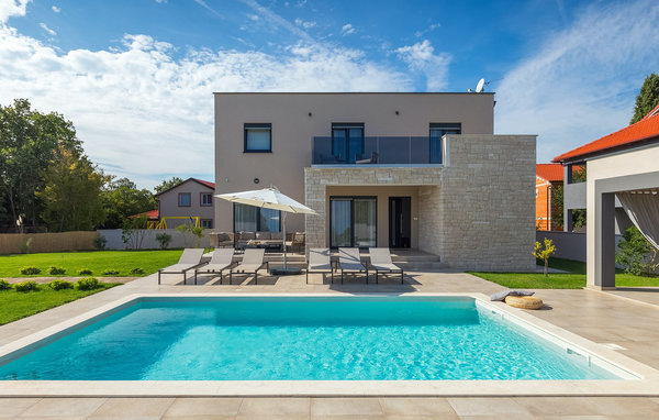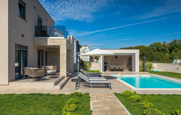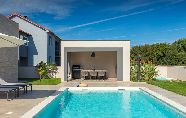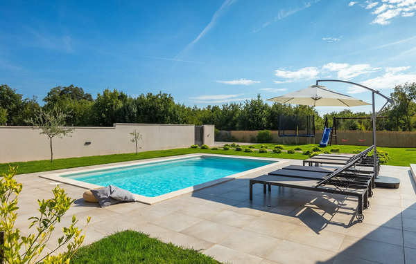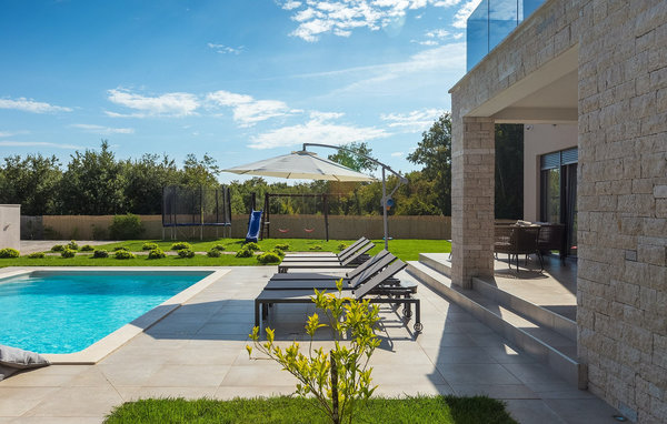 The stunning Villa Omnia is located in the small village of Loborika near Pula. The villa is an architectural open-space gem and is a great base for an unforgettable summer holiday. The villa can accommodate up to 6 people in 3 comfortable bedrooms. One of the bedrooms has 2 single beds that can be put together, while the other 2 bedrooms each have a double bed. All bedrooms are located on the first floor, while the ground floor is reserved for the living areas. There you will find a bright, modern kitchen, from which you can access the dining area and finally the living room, where you can relax wonderfully. The outdoor area is adorned with the beautiful pool, which is just inviting to get in and refresh yourself on hot summer days. The lounge area and outdoor kitchen offer additional shade and are the perfect place to hide from the sun. The villa also offers two swings, a slide and a trampoline so that your little ones can also enjoy their stay at Villa Omnia. The villa offers private parking for up to 3 cars, free WiFi and is fully air-conditioned.Villa Omnia is a short drive from Pula. Pula is the tourist centre of Istria, culturally and traditionally, but also because of its beautiful natural landscape. The city of Pula experienced its heyday in Roman times. The Romans left their mark, in particular the beautiful amphitheatre. In Venetian times, Pula developed into the control centre of the Adriatic Sea