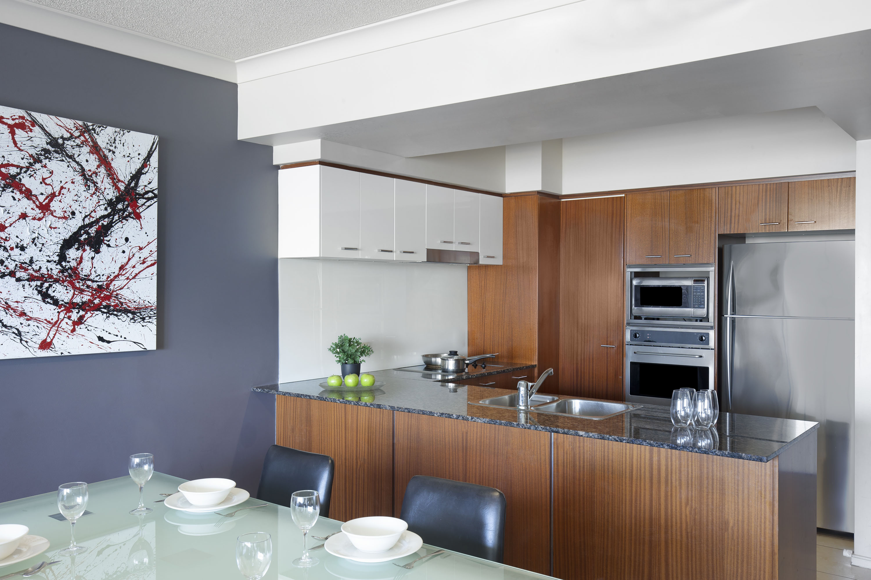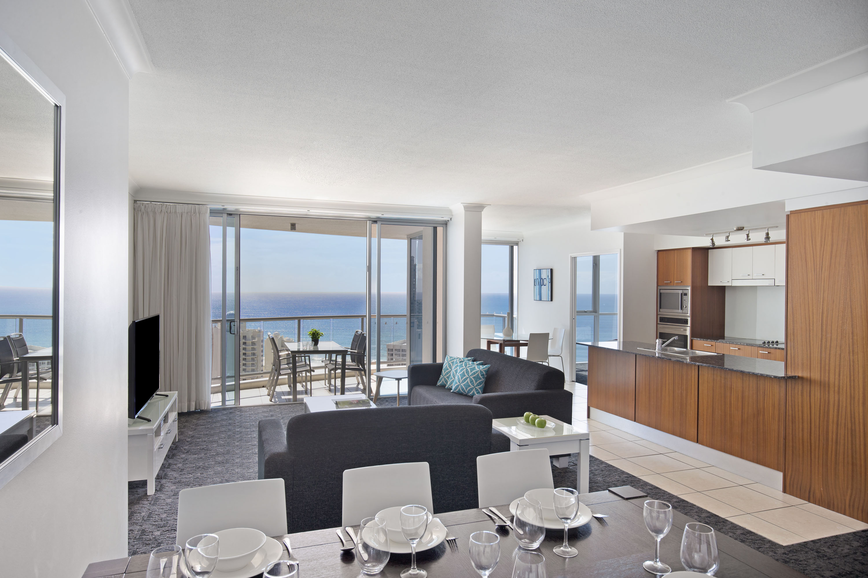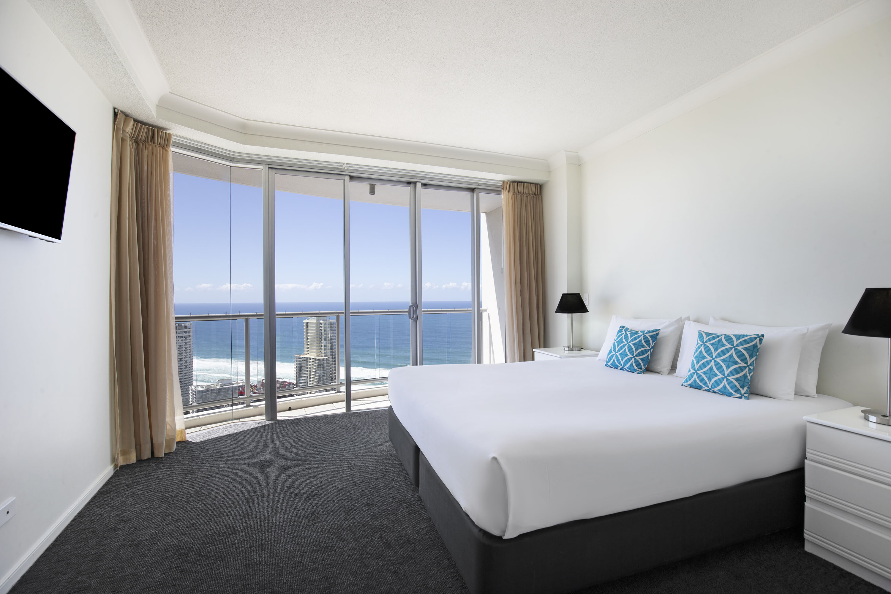 The hotel is located in the heart of Surfers Paradise, guests will find the perfect accommodation from which to explore the beautiful and fun filled Gold Coast. All apartments are self-contained and feature kitchens equipped with modern appliances, a full service laundry, cable TV and a DVD player. All the conveniences of home can be found here. Located atop the trendy Chevron Renaissance precinct, guests need only duck downstairs to enjoy a delicious meal or to wander through unique and designer boutiques. If you are on holiday with the kids, the Infinity attraction is a must visit. They are bound to be entertained exploring the fun house full of mirrors, optical illusions and sound effects. Visitors can choose between 1, 2 and 3 bedroom apartments or superior apartments, which are furnished in contemporary neutral tones. Or for larger groups wishing to truly holiday in style, the 3 bedroom penthouse apartments are the ideal choice. The hotel offers an access to the resorts indoor and outdoor lap pools and full gymnasium, BBQ facilities, the private theatre and also Beaches in the Sky, the resorts outdoor leisure area featuring sub-tropical gardens and a 600m2 lagoon style pool.