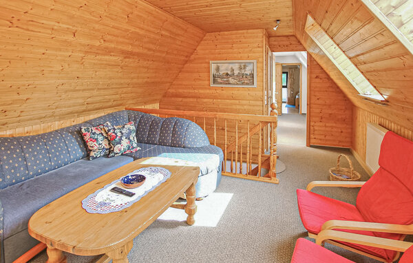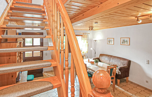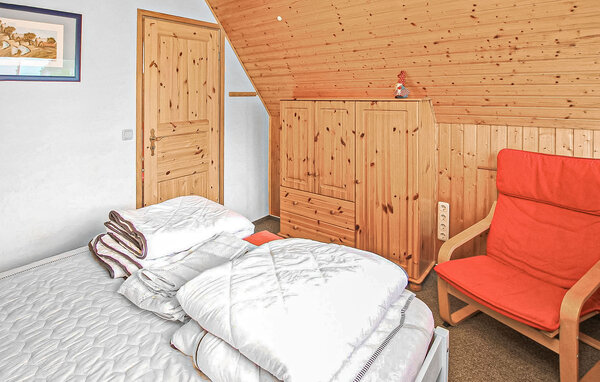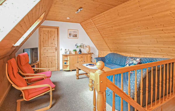 This non-smoking apartment with separate entrances is equipped with insect screens on the windows and is centrally heated. The approx. 110 square metre apartment for up to 8 adults and 1 baby is spread over two floors. On the ground floor there is a large dining room (dining table, wood-burning stove - wood on request) with adjoining kitchen (electric cooker with oven, fridge with freezer, dishwasher, microwave, various small kitchen appliances) and the bathroom (shower, bathtub, WC, washing machine). A staircase leads from the dining room to the upper floor to an open-plan living area (upholstered suite, armchair, flat-screen TV), a guest WC and the 3 bedrooms. (1 x double bed 1.60 m wide, 1 x large double bed - passageway to the 3rd bedroom with 2 trundle beds) The apartment has a large, covered and furnished seating and barbecue area in front of the house. A cot and high chair are also available here.